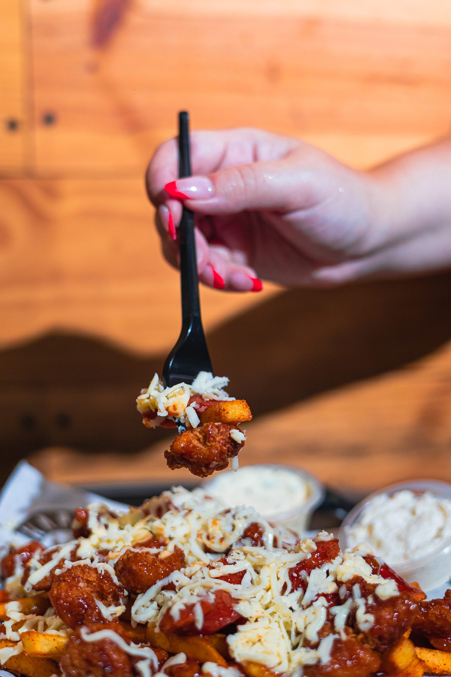 Papas a la francesa bañadas en bbq o bbq jager, acompañadas de crispetas de pollo en salsa de parmesano, salchicha tipo americana, queso rallado, ensalada coleslaw y sour cream.